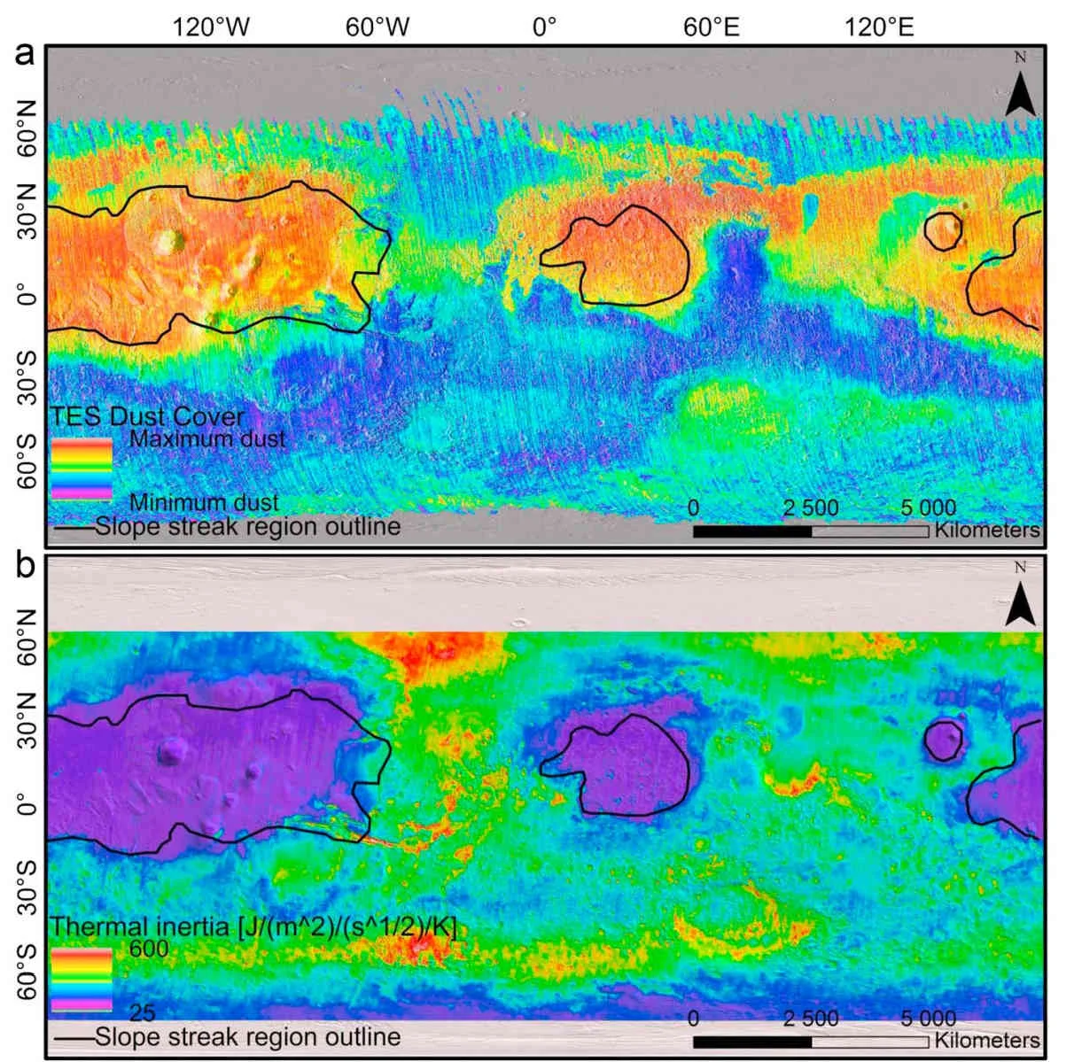 The slope streaks observed on Mars usually occur in dusty areas with low thermal inertia, as indicated by the circled regions. Credit: Bhardwaj et al. (2019), Figure 8