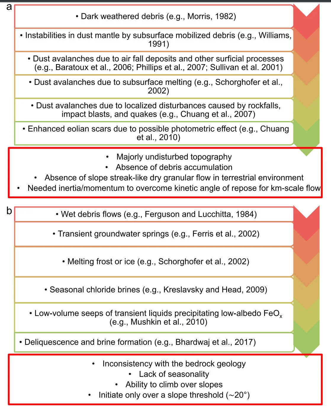 Literature of the proposed mechanisms that likely cause slope streaks and issues related to them. (a) Dry mechanisms and (b) wet mechanisms. Credit: Bhardwaj et al. (2019), Figure 6