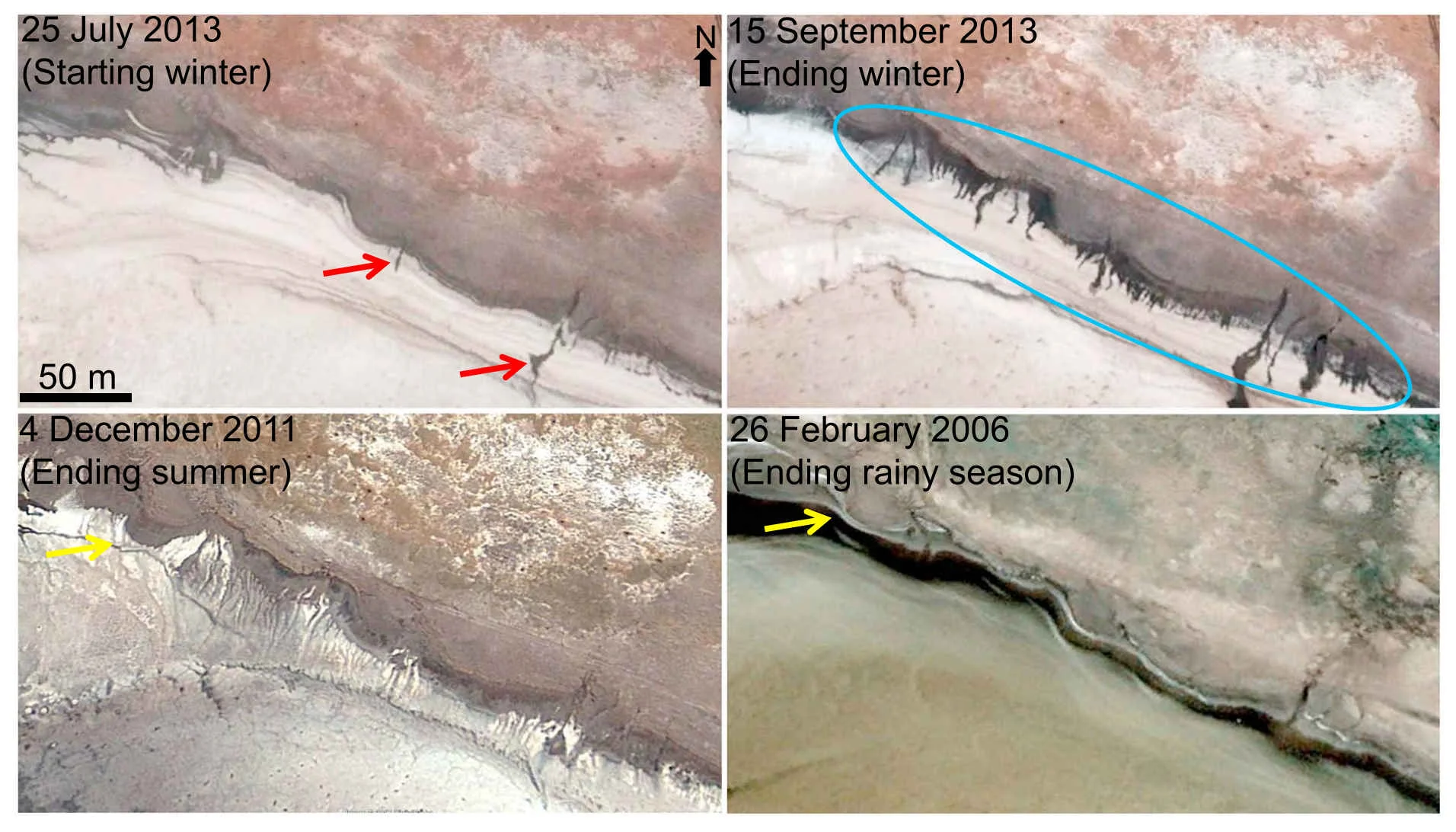 Terrestrial slope streaks analog using the Salar de Uyuni in the Altiplano of Bolivia. Similar slope streaks were observed in satellite imagery during the winter (dry) months. The streaks were caused by an aqueous brine. Credit: Bhardwaj et al. (2019), Figure 14