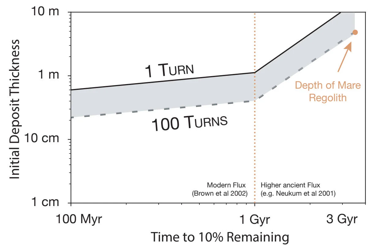 Another interesting use of the model is predicting how thick an initial regolith ice deposit would have needed to be to survive from formation to today. Depending on how many impacts occurred (and regolith turnovers), the initial deposit would have needed to be between 5 and 10 meters in depth in order for 10% of the ice to remain today.