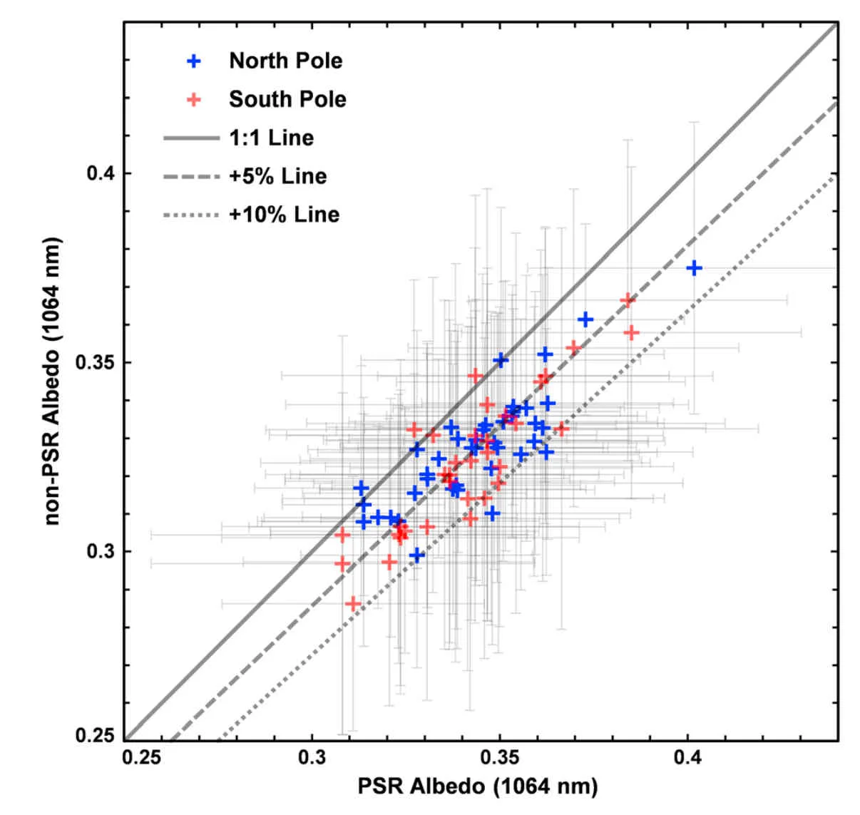 Comparing LOLA albedo measurements from PSRs and adjacent non-PSRs. The average PSR was about 5% more reflective than the adjacent non-PSR. The most likely explanation for this is the presence of surface ice. Credit: Qiao et al., 2019, Figure 3.